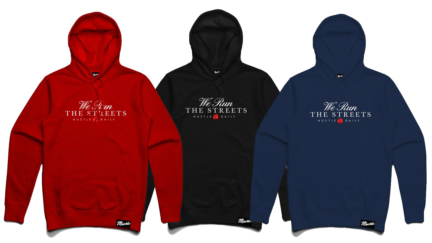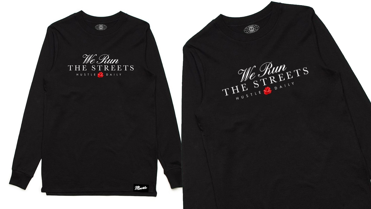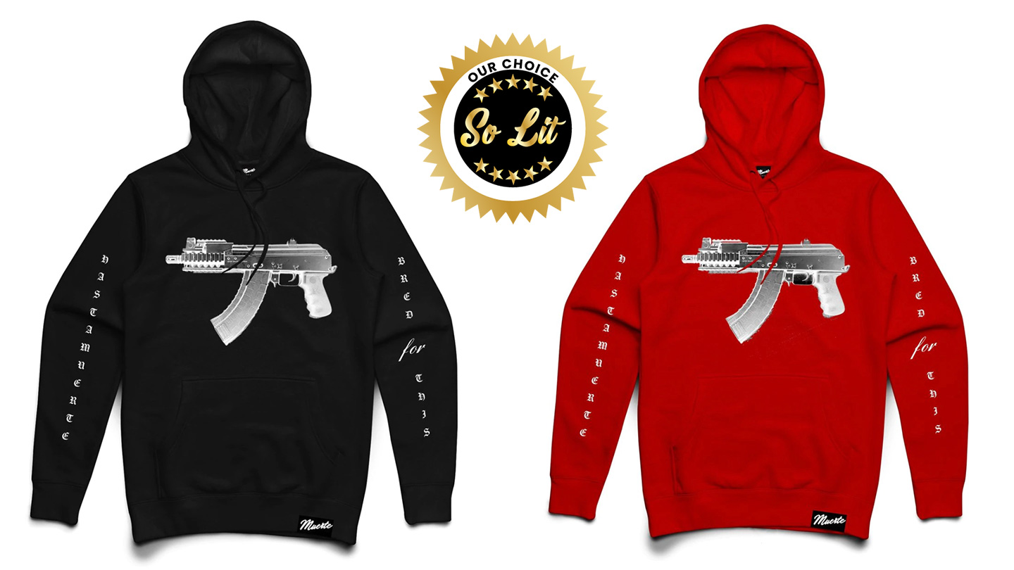 Something you might say when you see all of these pieces is “Damn, this stuff is dope!” That’s exactly what went through our minds when we saw the collection. One item we’re especially into is the Bred for This hoodie. It’s cut from 100% brushed cotton and features hastamuerte down one sleeve, Bred for This down the other with a big fat Uzi on the chest. A kangaroo style pouch and matching drawstrings tie it all together. Rock this with your Jordans with pride. They were Bred for This.