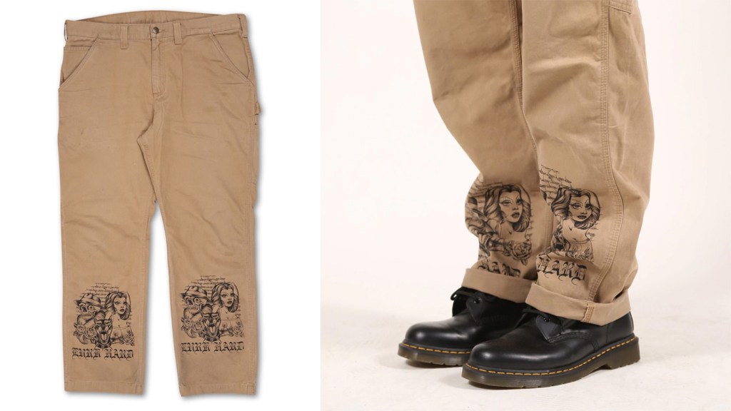 One of the things we appreciate most about Lurk Hard is the brand doesn’t have to try to be hard, it just is. Simple styles, boxy cuts and fierce graphics get the job done with quality. The one item that jumps out of this collection are these Stein Orange Coveralls. Cut from distressed cotton in this prison like orange colorway, they feature 4 front pockets, 2 back pockets, screen-printed back patch and woven front patches. This is a one size fits all item so you’ll have room to fluctuate if you need it.