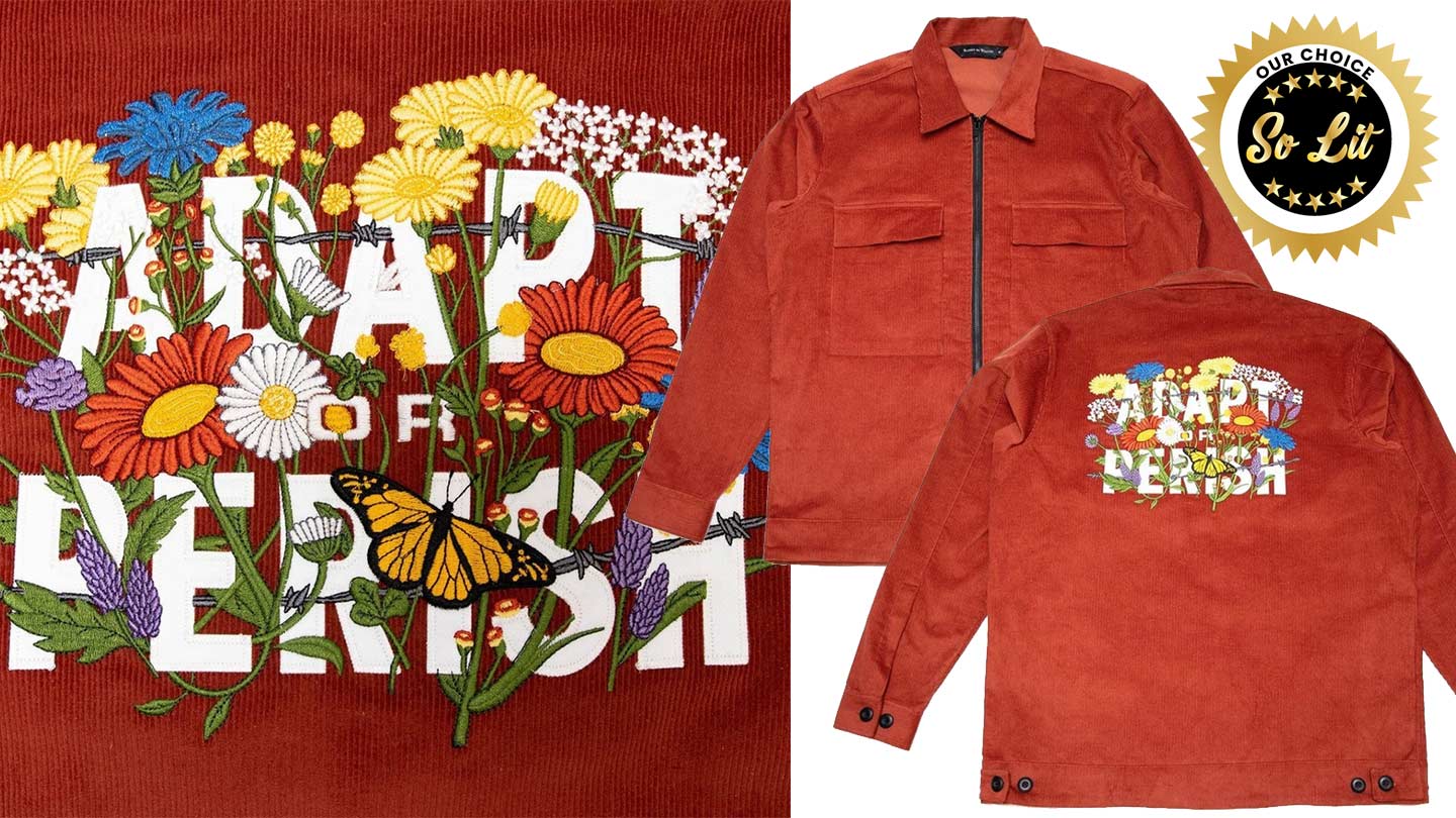 When this Adapt Or Perish Corduroy Blouson Jacket first dropped this spring we added it to our cart but it was gone before we could complete the transaction. Thanks to this restock, we copped our size and then came back and wrote this post. “Adapt or Perish,” that’s a bold statement and one that’s 100% on point. Let’s face facts. Without change, not only our country, but our whole world is in serious trouble. The struggle is real people and what we need is more positivity and less hate. Wear this jacket when out and about and you’ll conjure up positive vibes everywhere you go.