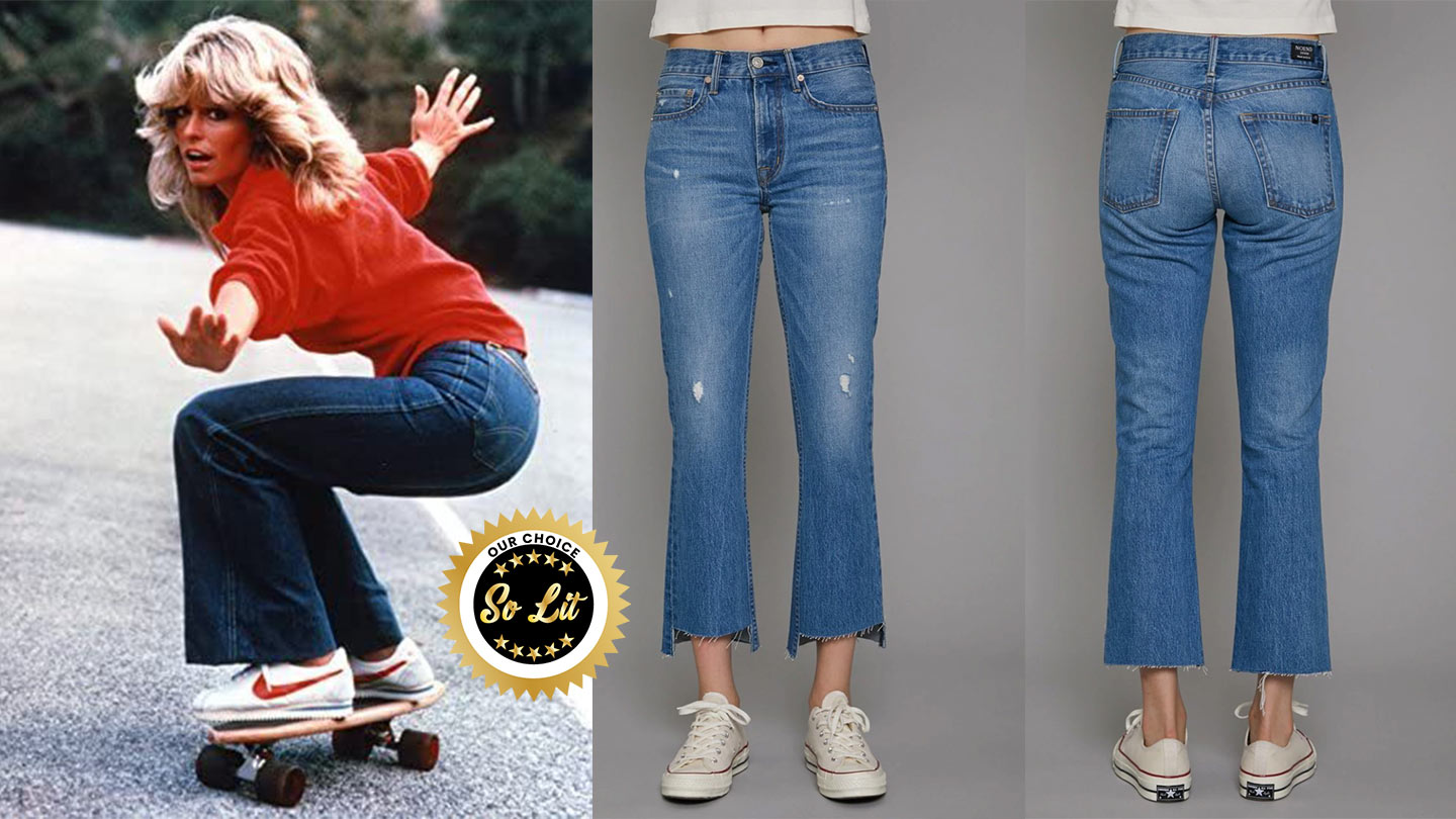 When we first saw these Farrah Kick Flare Jeans the image that first came to our mind was the iconic pic of the amazing Farrah Fawcett (RIP) on a skateboard wearing bell bottoms and Nike Cortez sneakers. Nothing screams 70s-80s fire more than this. This new iteration from NOEND captures that classic bell bottom flared styling while adding cropped hems that will perfectly showcase your footwear.