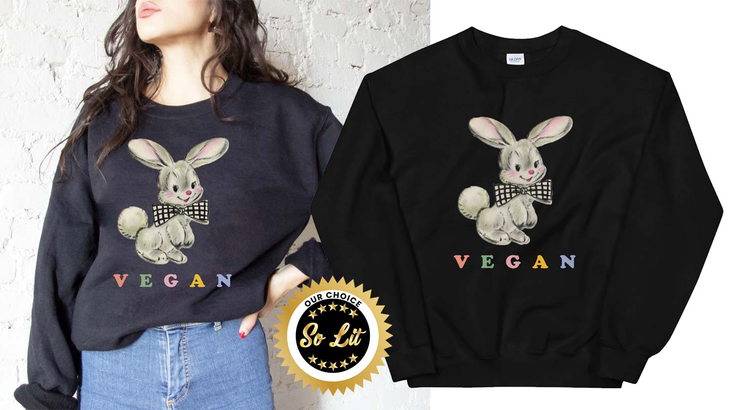 Easter is right around the corner and that means we’ll be seeing lots of bunnies and other cutesy spring stuff, but who knew we’d see this handsome fella sporting that debonaire bow tie on this tots adorbs Vegan Bunny Sweatshirt? This is a sturdy and warm sweatshirt that’s bound to keep you warm in the colder spring air. Pre-shrunk for a classic fit it’s cut from air-jet spun yarn for a soft feel, reduced pilling and remember…. no meat allowed!