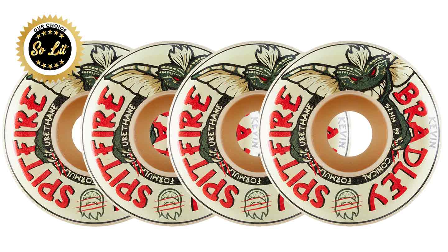 WTF! Who fed the Mogwai after Midnight? Now the ish is gonna hit the fan. But seriously…Spitfire Formula Four has been developed over many years with a heavy amount of research and development by the Spitfire skateboard team. It’s definitely their most popular and best urethane to date. It offers longer lasting performance, unmatched abrasion, fewer flat spots and gives a lasting speed. These After Midnight Wheels created for team rider Kevin Bradley will help you show your sinister inner self no matter how cute and cuddly you appear to be on the surface.