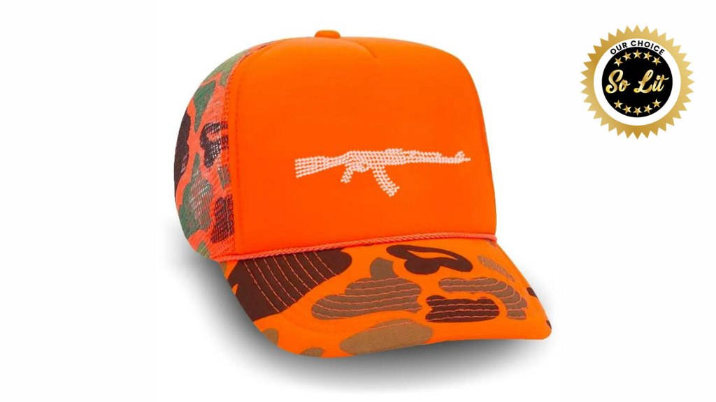 If you haven’t noticed, trucker hats have been blowing up lately on the streetwear scene. It’s most likely due to the weather being a lot warmer because the mesh backing helps keep you cool while looking hot. Not only that, the adjustable snapback closure accommodates short hair, long hair or even no hair. Nothing blings harder than an iced out AK47 and that’s why we’re adding this Clear Rhinestone Trucker Hat to our cart. It features a curved bill and an AK47 with a curved clip wrapped in safety orange camo. This is the ideal dome piece to go Buck hunting in.