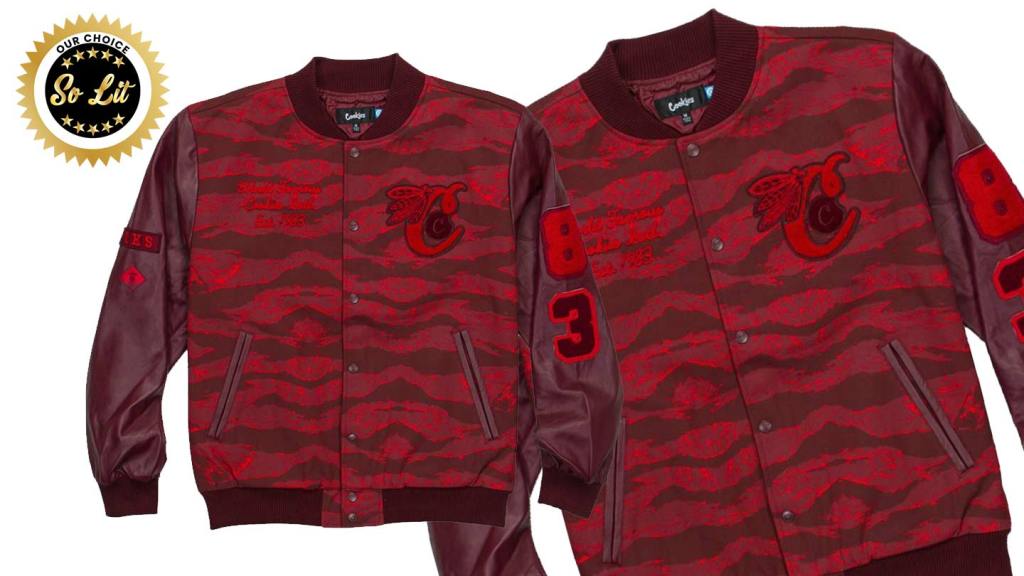 Top off your streetwear style in the all-new Cookies Top Of The Key Letterman Jacket. This color-blocked varsity jacket features a tiger camo pattern and soft leather sleeves. It also displays Chenille Cookies patches throughout, with more Cookies detailing embroidered on the left chest area and two side pockets to hold your stash. They call it top of the key. It’s certainly top shelf for hoopers and smokers alike.
